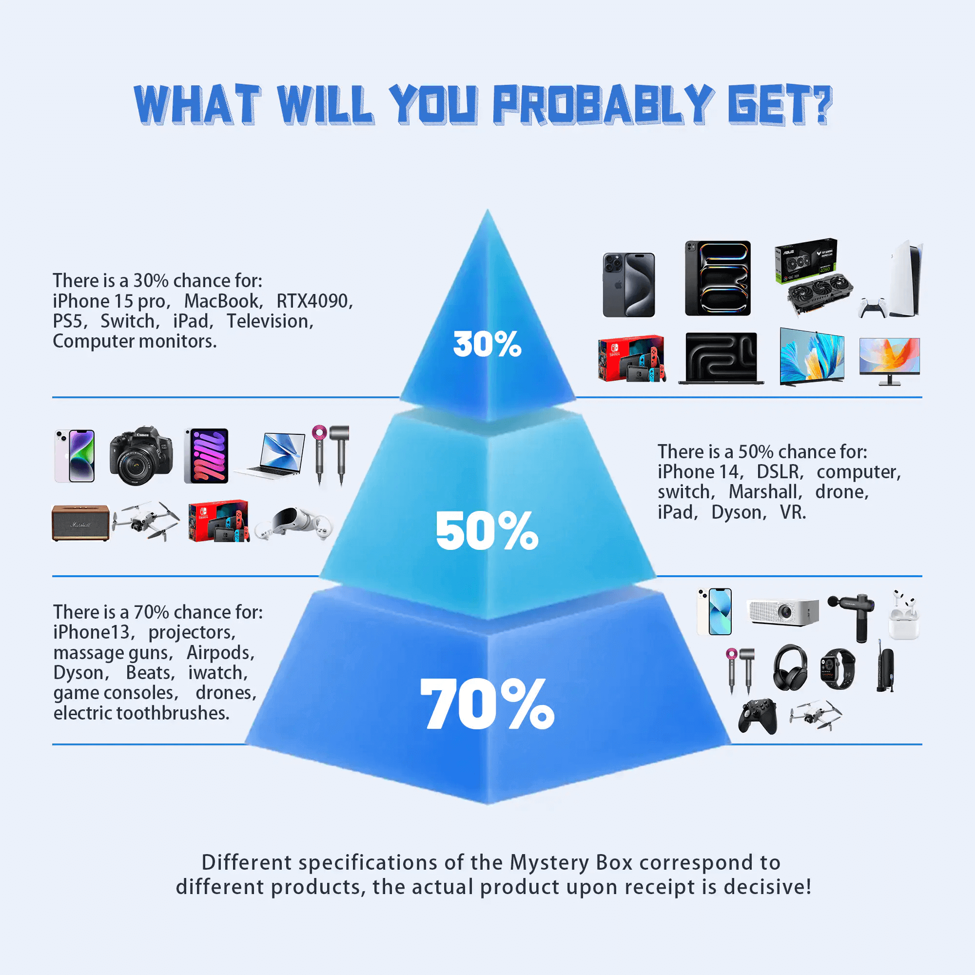 Note:The mystery box contains large electronic products, household appliances, large toys, outdoor equipment and various smart electronic devices